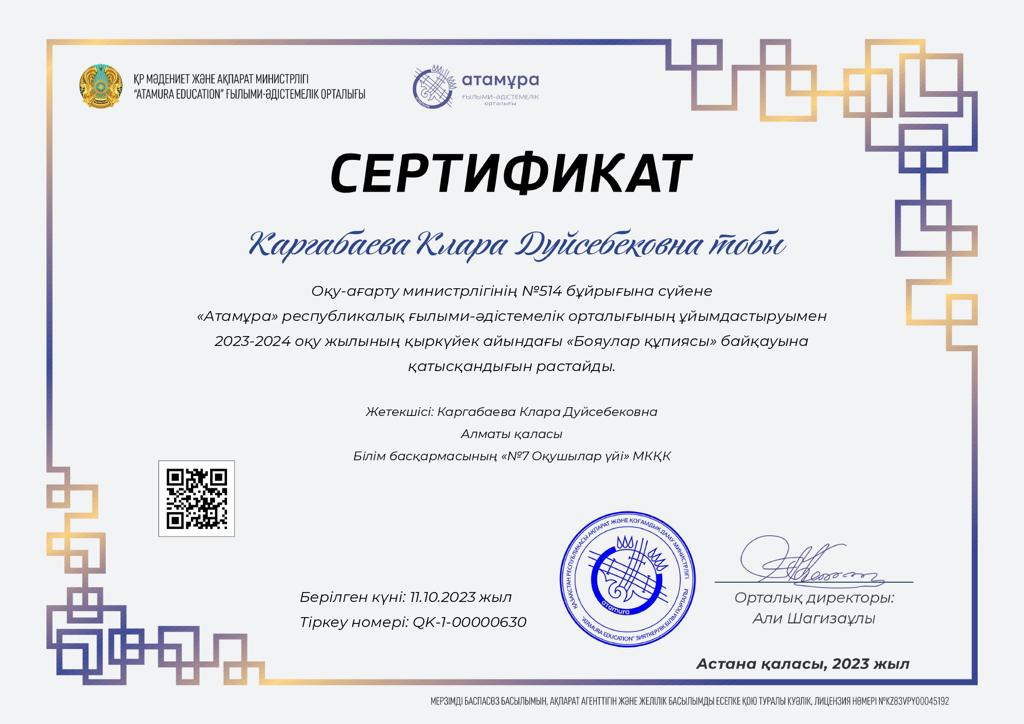 "Атамұра" республикалық ғылыми- әдістемелік орталығының ұйымдастыруымен өткен "Бояулар құпиясы" байқауына "Ақзер" қолданбалы өнер студиясы "Жер-ана" тақырыбында дәнді дақылдармен жұмыс жасап, байқауға қатысты. Байқаудан "Бас жүлде" алды. Жетекшісі Каргабаева Клара Дүйсебековна. Марапаттарың құтты болсын! Шығармашылық жұмыстар тілейміз!